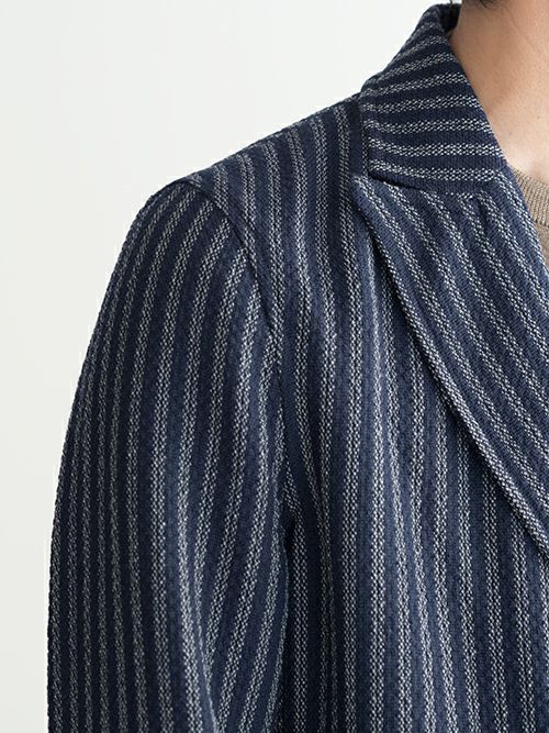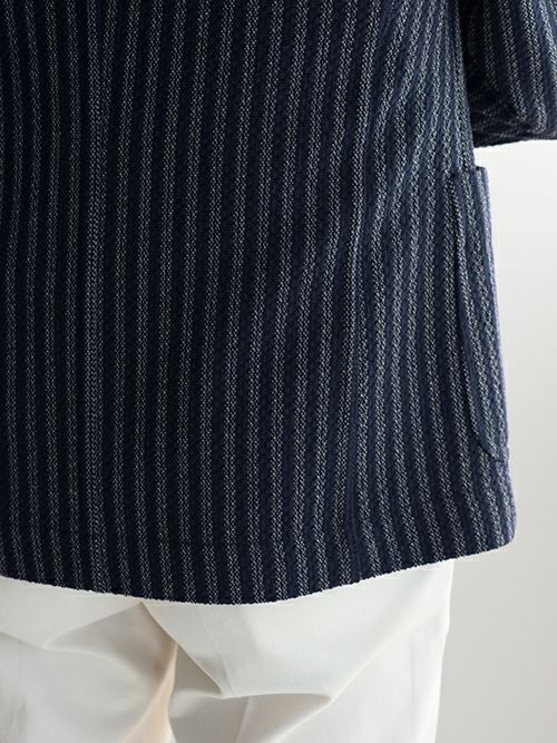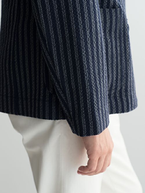 カットソーやニットの上に気軽に羽織れるストライプ柄ジャケット。もちろんタイドアップも可能な、オンオフ活躍する万能アイテムです。
