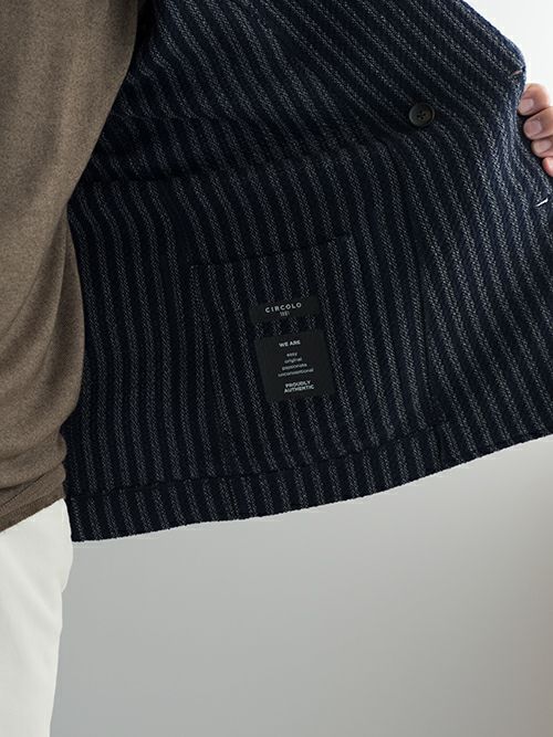 ピークドラペルのドレッシーな雰囲気と、袖釦なしのディテールや、生地にストレッチのきいたリラクシーさを兼ね備えたチルコロらしい一着。