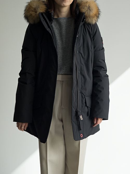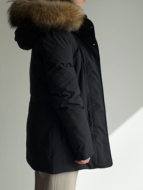 着膨れしにくい、程よくすっきりしたラインで着て頂けます。-25℃対応の防寒機能の本格派ダウン。ヒップが隠れるミドル丈なので、どんなボトムスともコーディネートして頂きやすいです。