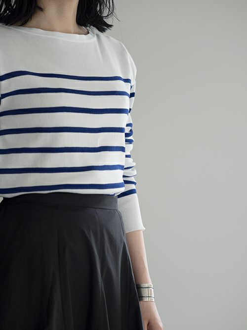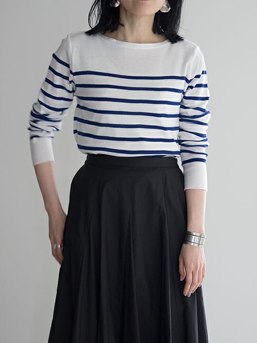 ボートネックの浅いネックラインが大人の余裕感を演出。ボトムスは選ばずに幅広くコーディネートを楽しんで頂けます。