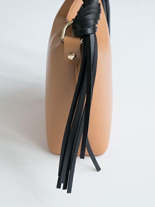 両サイドに垂れたレザーフリンジが印象的なバッグ。フリンジは取り外せて、結ぶ位置で長さ調節も可能。好みの長さで持つことが出来ます。マチがあるのでしっかり必需品も収まり、上部釦仕様でセキュリティもしっかりしていて安心して使えます。シンプルながらも存在感があり、様々なコーディネートに華を添えてくれるバッグです。