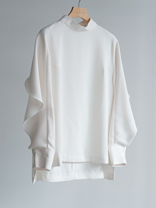 背中から袖にかけたフリルが印象的なブラウス。ハイネックのデザインととろみのあるポリエステル素材が甘くなり過ぎずに、上品な雰囲気で着て頂けます。カジュアルシーンはもちろん、フォーマルにもおすすめの一着です。