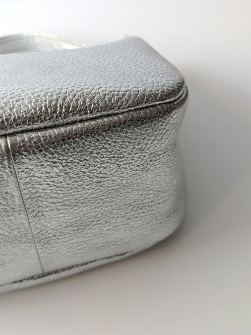 小ぶりでスタイルを選ばないフォルムで持ち手を片側を引っ張ることで丸みが出てコンパクトな印象になります。また少し太めのショルダーが付属で付くので両手をあけたい、ご旅行などにも持っていきやすいです。コンパクトなサイズながらマチがあり、見た目以上に収納力があるのも嬉しいポイントです。また、表にポケットはありませんが、取り外し可能な小物ポーチがついております。合わせるお洋服のカラーも選ばず、スタイリングのポイントになります。