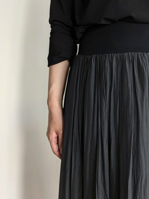 上品なサテン地を使用したロングスカート。動くたびにふんわり揺れる女性らしいシルエットを演出。ウエストマークのリブゴム仕様なのでカットソーやブラウスをインしたスタイルもキマります。