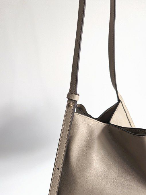 華奢な細いハンドルと、口元を十字に留めた時の独特なフォルムのバランスが特徴。型崩れを防ぐよう、底は固い作りになっています。