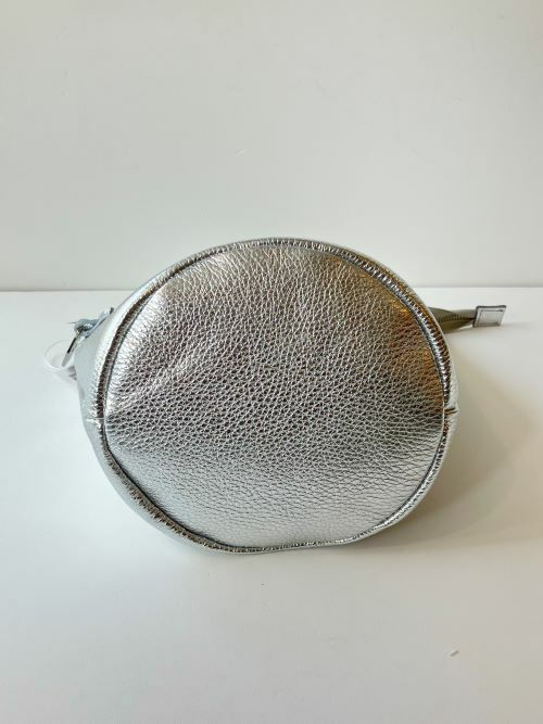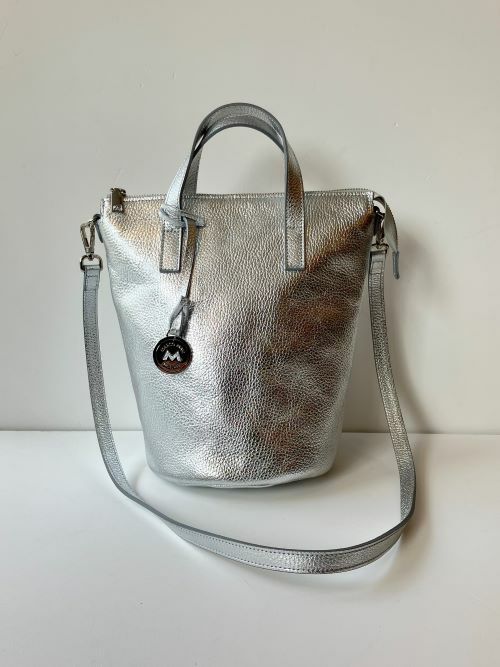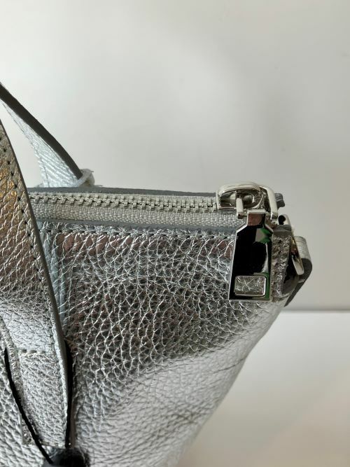 洗練されたデザインのシルバーメタリックハンドバッグです。ショルダーストラップがついており、デイリーから特別なシーンまで幅広く活躍するアイテムです。フロントのロゴチャームがアクセントとなり、シンプルながらも存在感のあるデザインです。