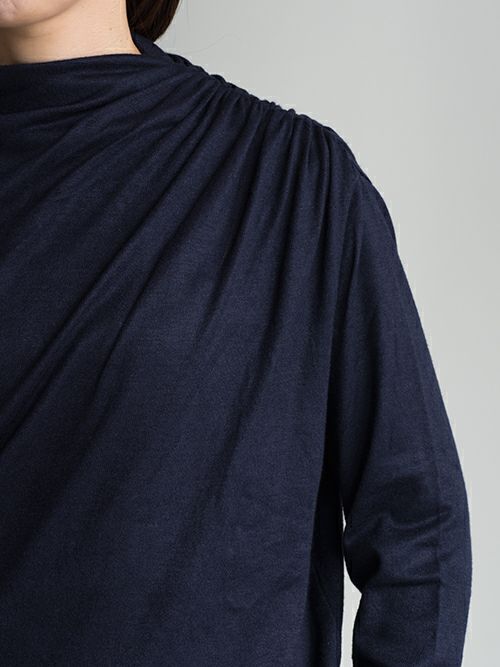 静かな個性が光る1枚ネックから肩にかけてアシンメトリーに寄せられた繊細なギャザーデザインが、柔らかな立体感を生み出します。片側に施されたボトルネックが、シンプルな中にモードなニュアンスを添えて。ハンドメイドならではの温かみと丁寧な仕立てが感じられる一着です。コットンとレーヨンをブレンドしたカットソー素材は、しっとりとした肌触りと程よい伸縮性で、快適な着心地を叶えます。日常に溶け込みながらも、さりげなくスタイルを引き立ててくれる、大人のためのベーシックアイテムです。