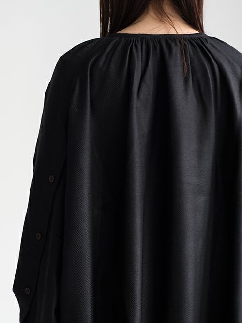 贅沢にたっぷりとシルクを使用し、ほどよい重みと上品な光沢が魅力です。袖後ろのカウスにはボタン開閉のデザインを施し、インナーを覗かせた着こなしも楽しめます。個性がありながらも、エレガントで洗練された印象に仕上がる一枚です。