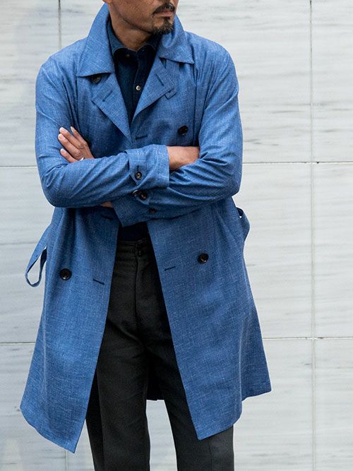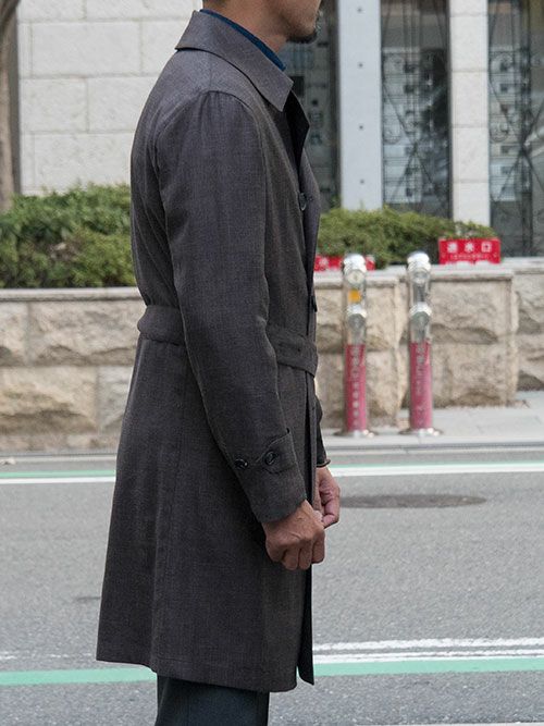衿立ちを良くするために上衿のみやや厚みのある芯地を使用し、コシを出しました。これにより着用時の自然な衿立ちが実現します。