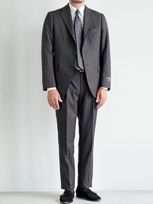 ジャケットはノッチドラペル、フラップポケットで3つボタンの段返り仕様。毛芯には本バス毛芯(馬の尾毛)を使用し、衿元から胸にかけてハリを与え立体的なシルエットをになります。毛芯の中でも最高峰の物を使用しております。