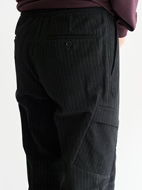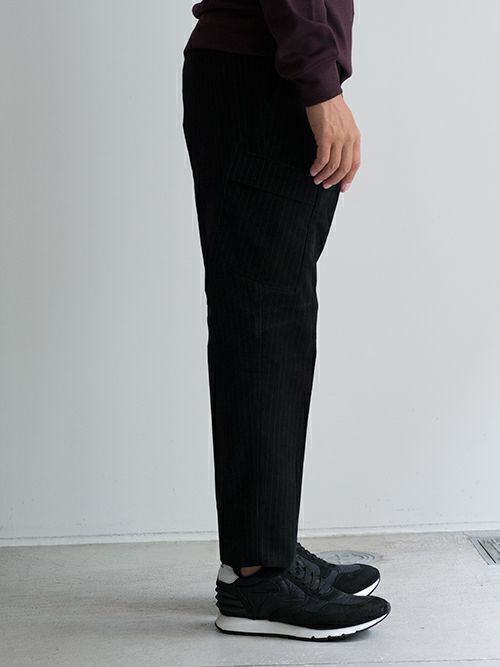 ウエストはドローコード仕様で、膝下はしっかりとテーパードを効かせたワンプリーツパンツです。サイドにポケットが付いたカーゴ仕様になっており、タイドアップからスポーティなジャケットスタイルまで、幅広く着用いただけます。