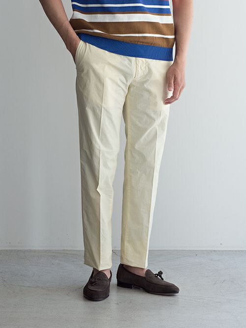 柔らかく綺麗な色目のカラーパンツ。紺ジャケや白シャツなどの定番アイテムと合わせるだけで旬の着こなしができます。