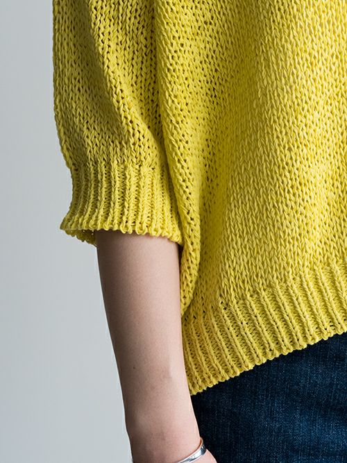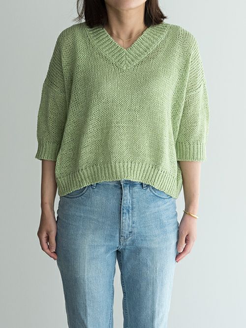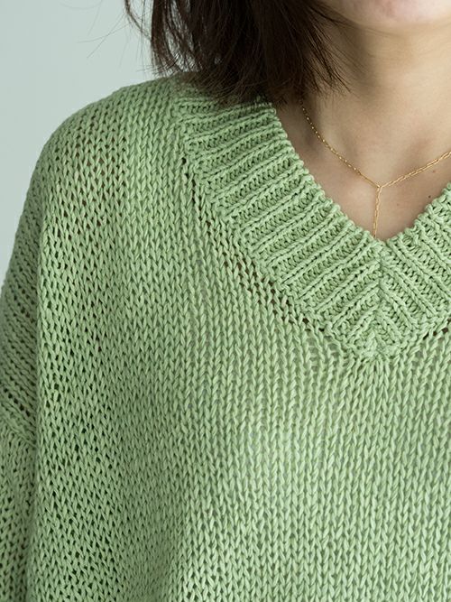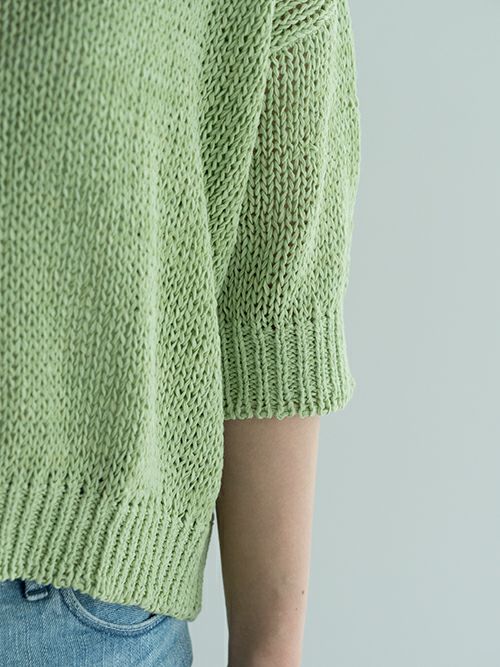コンパクトで編み感とガーメントダイ(製品染め)の風合いがポイント。ガーメントダイ(製品染め)することにより1点1点同じものがなく自分だけの1着になります。ボトムはワイドめのパンツやカットソーなどにレイヤードしてコーディネートの幅が広がります。