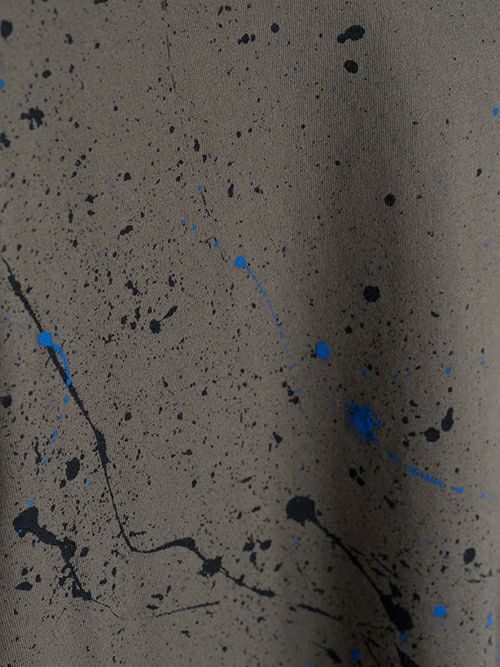 フロントに入るのは、筆でペンキを散らしたようなペイント柄。黒い箇所は染み込みプリントですが、青い箇所は少し立体感があり、エッジの効いた仕上がりです。