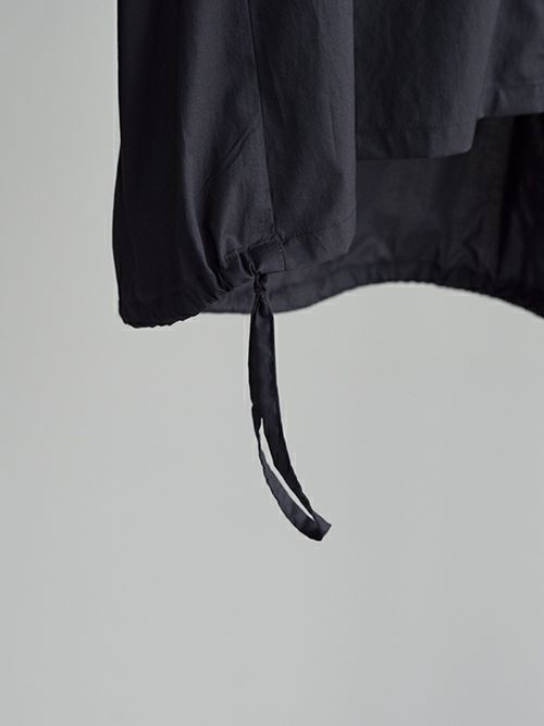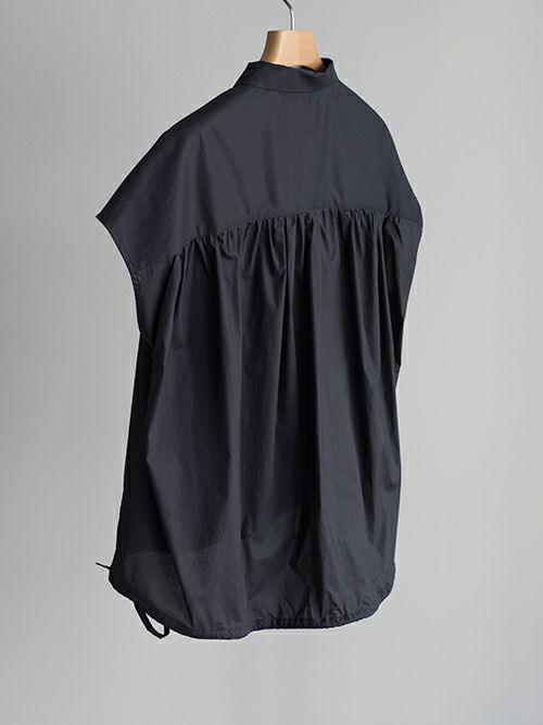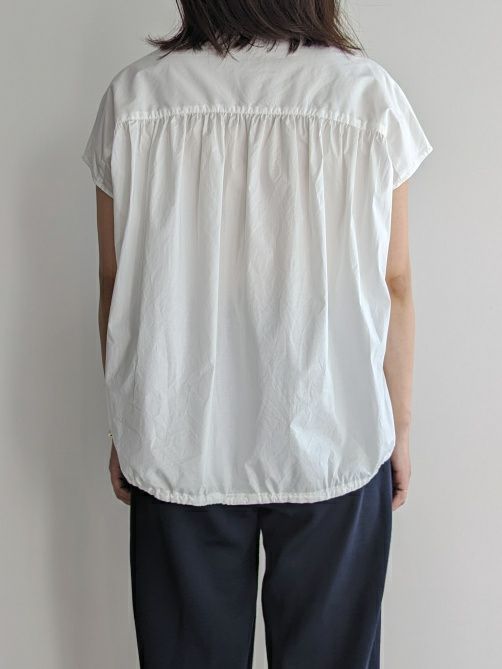 ヨークから細かなギャザーを施し、フェミニンな印象に。後ろ側の裾紐を絞ることでシルエットにアレンジをつける事が出来るので、あわせるボトムスでいろんなスタイルを楽しめます。