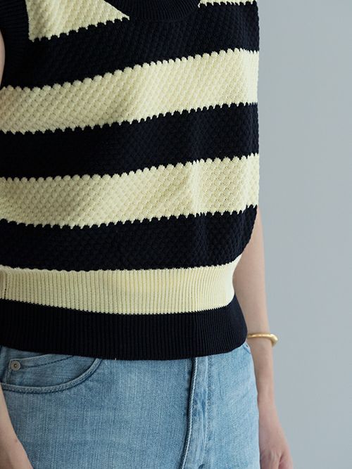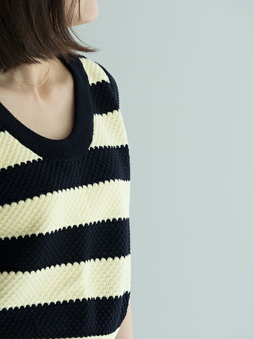 少しショート丈のノースリーブニット。1枚で着ても存在感のある太めのボーダー柄です。カットソーなどと重ねて、ベストのように合わせても雰囲気良く着こなしていただける一着。ネック部分の開き感も、女性らしく綺麗に見せてくれます。スカートやワイドパンツと相性が良く、またジャケットのインとしても活躍する汎用性の高さも魅力。