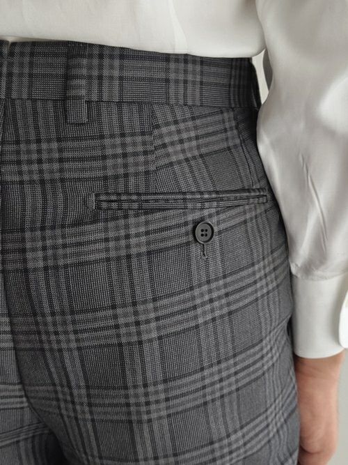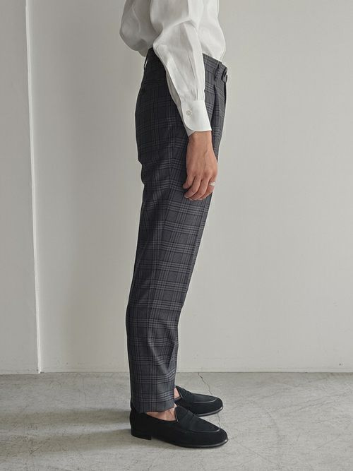 腰回りには程よい余裕を持たせ、膝下はしっかりとテーパードを効かせたワンプリーツパンツ。