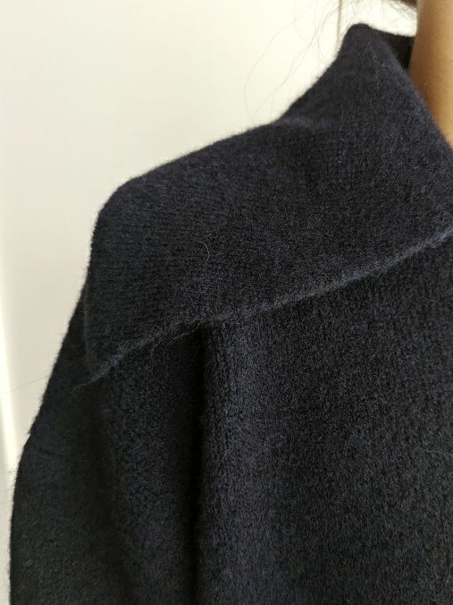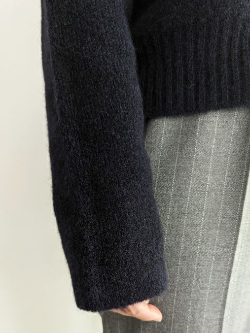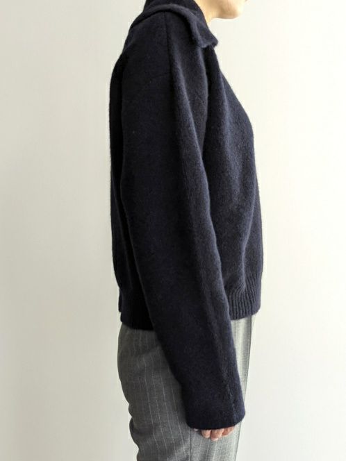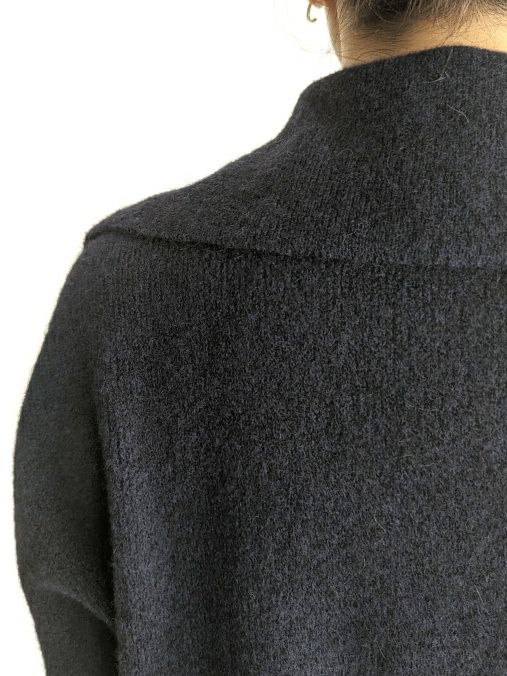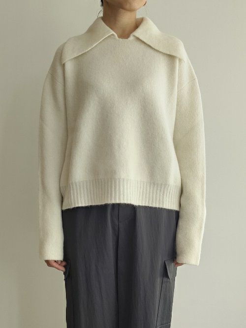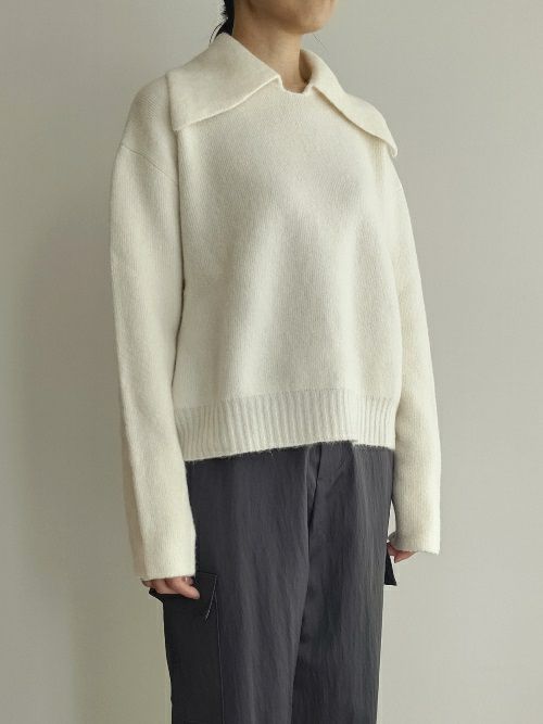 大きな襟が特徴的で、洒落感と愛らしさがあふれるニット。トレンドのビッグシルエットで、着丈はショートになっています。
