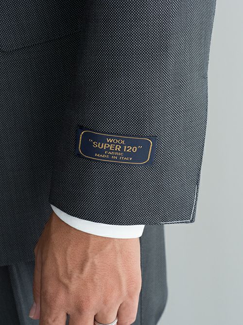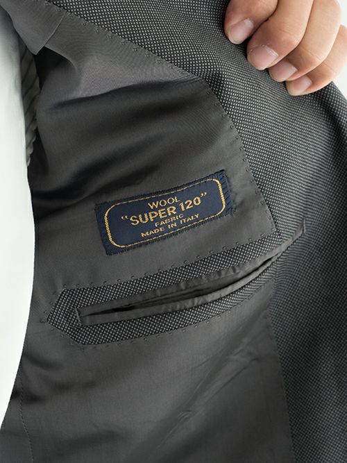 ジャケットはノッチドラペル、フラップポケットで3つボタンの段返り、総裏地仕様。毛芯には本バス毛芯(馬の尾毛)を使用し、衿元から胸にかけてハリを与え立体的なシルエットをになります。毛芯の中でも最高峰の物を使用しております。