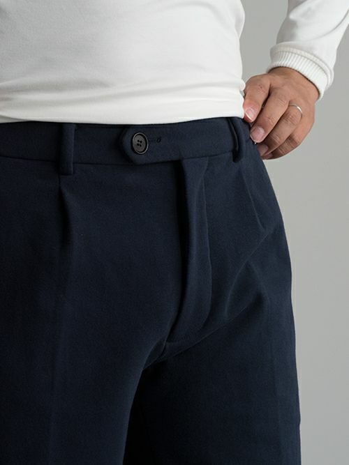 後身はシャーリングでスポーティーな仕様ですが、フロントは持ち出しを長めに取り、ベルトループをセットしたワンプリーツ。バックポケットは両玉縁で、腰裏とスレキは日本製のストライプのシャツ生地を使用しています。