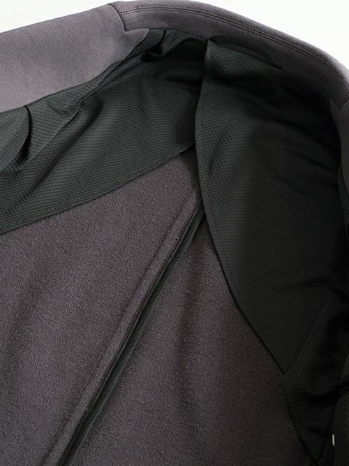 生地はスポーティーですが、襟ののぼりや前に振った袖付け、背抜き仕様の裏地には東レのストレッチ性の高いメッシュの裏地を手付で縫製。