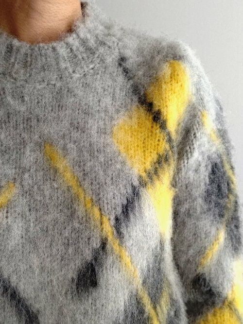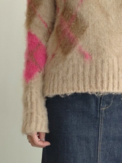 大きめのアーガイル柄に起毛感のある、シャギー仕上げで柔らかい柄の雰囲気を醸し出しています。コンパクトなサイズ感ですが、非常に軽くそして暖かい着心地。スカートやワイドなボトムにもコーディネートしやすいアイテムです。