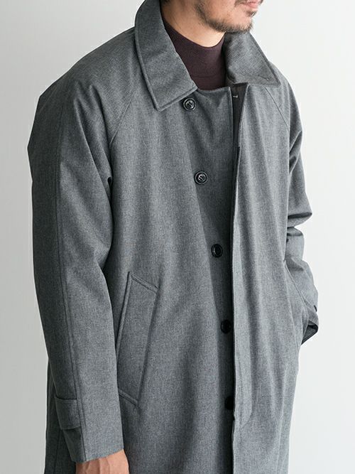 ウール混の中綿が入ったステンカラーコート。ラグランスリーブでシルエットも程よいゆとりがあるため、現在の空気感と快適な着心地を兼ね備えた一着です。