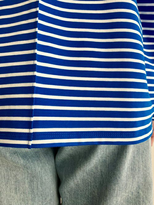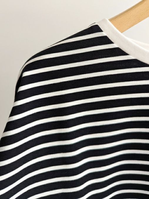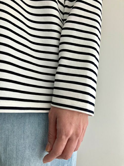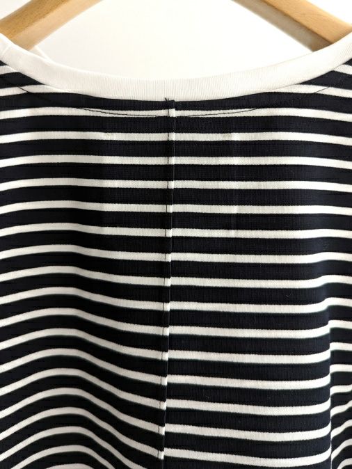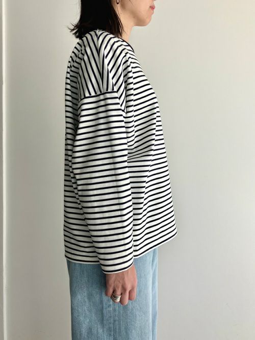 ドロップショルダーで立体的なコットンボーダー。後ろ身頃でステッチが入っており単調になりがちなボーダー柄をシンプルにデザインしています。