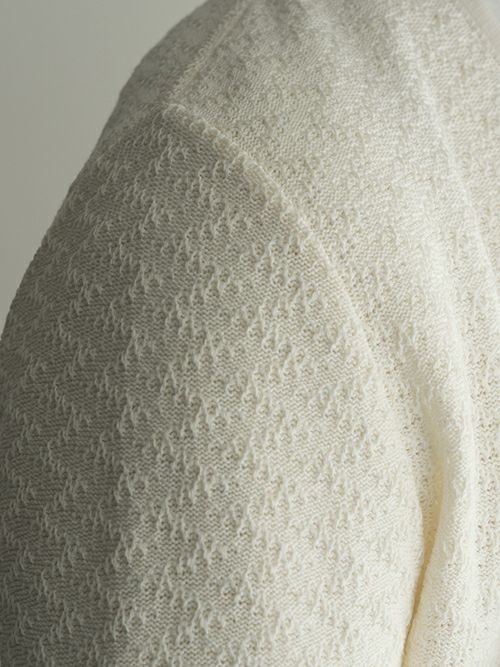色馴染みの良い淡いホワイトカラーで、深めのブイゾーンが印象的なデザインです。肩回りはすっきりとしつつ、身幅には程よくゆとりを持たせたシルエット。リラックスした大人のカジュアルスタイルに適した一着です。