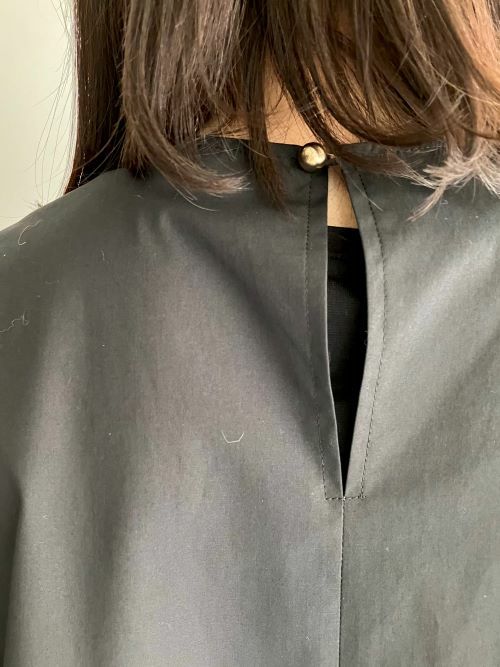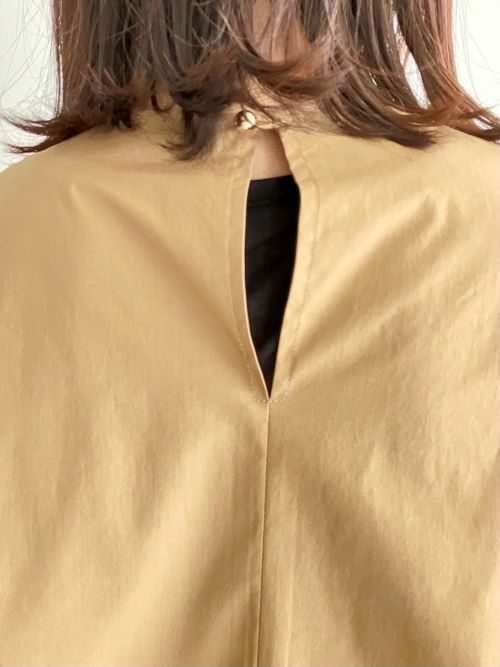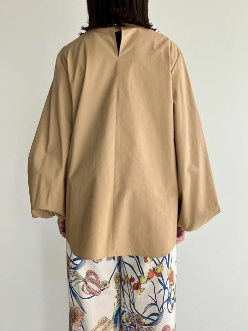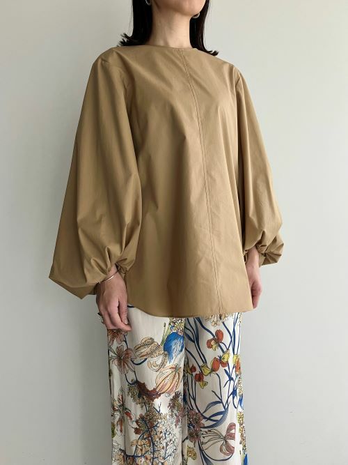 細身のAラインシルエットに袖先にかけてボリュームをもたせたスモックブラウス。張りのあるコットンポリエステルの素材で手首にゴムでギャザーを作りより立体的な形を出し生地のハリ感で甘くなり過ぎず、上品な雰囲気で着て頂けます。カジュアルシーンはもちろん、フォーマルにもおすすめの一着です。