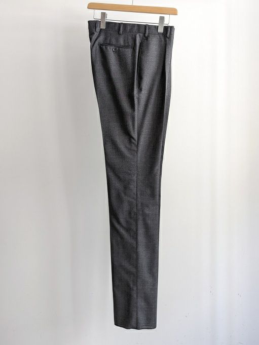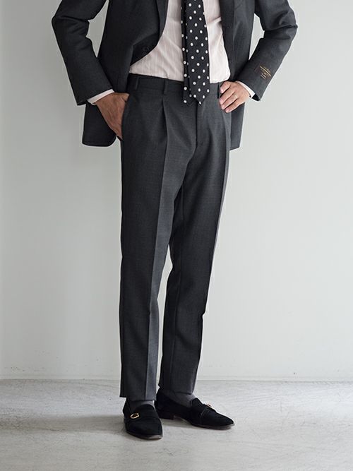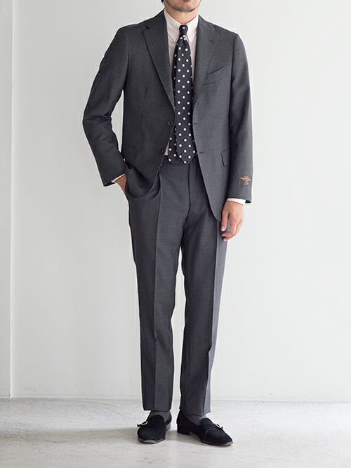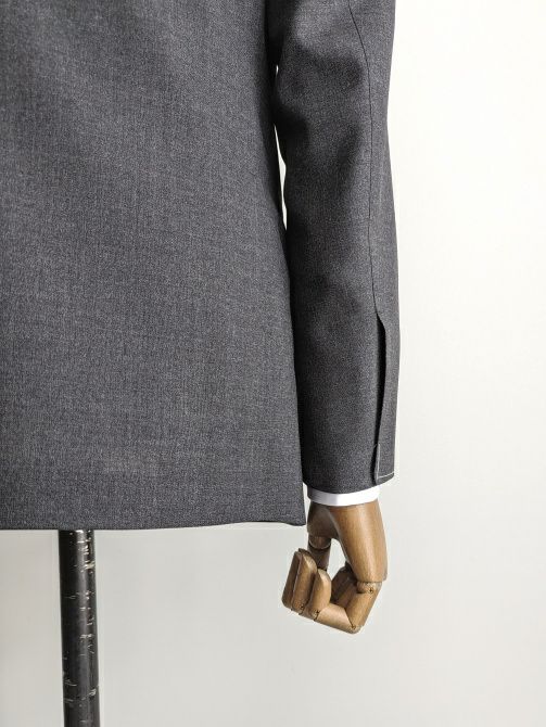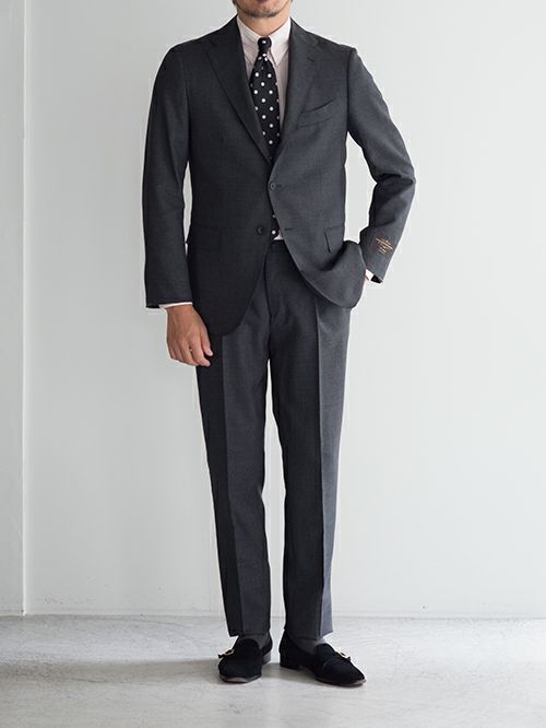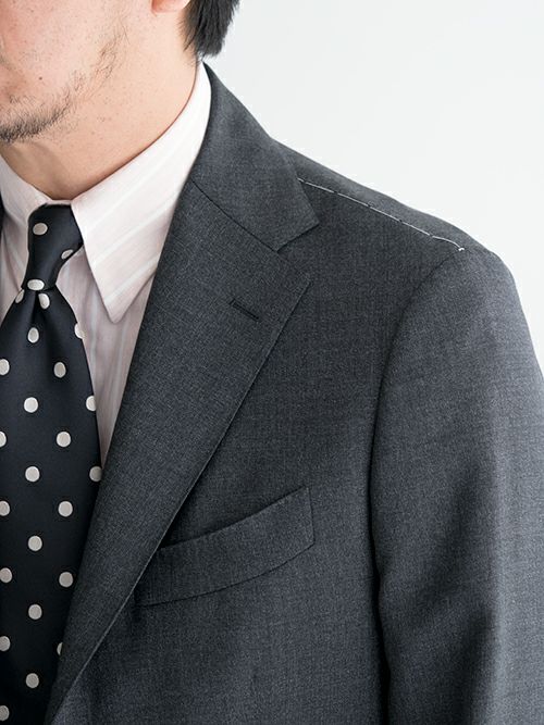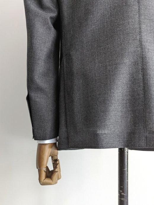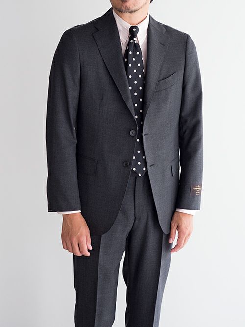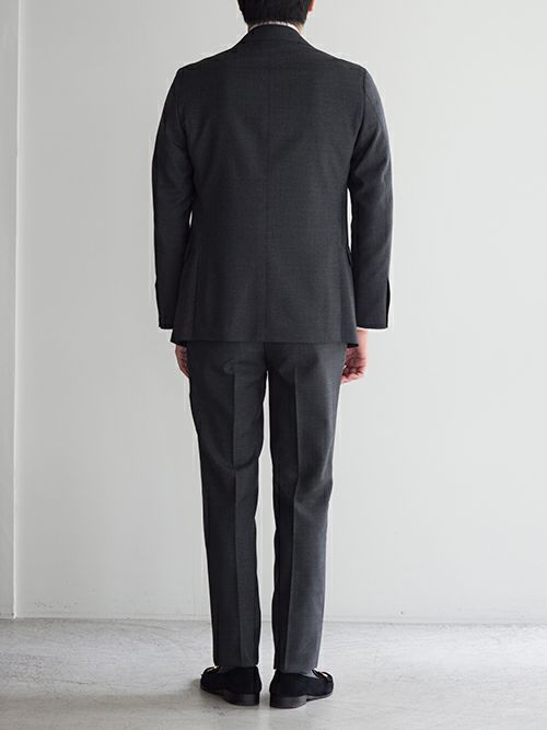 イタリア生地のVITALE BARBERIS CANONICO(ヴィターレバルバリスカノニコ)の生地を使用した、軽やかな着心地の春夏のスーツ。タイドアップや、インナーにニットと合わせるなど、幅広く着用いただけます。ジャケットはノッチドラペル、フラップポケットで3つボタンの段返り仕様。毛芯には本バス毛芯(馬の尾毛)を使用し、衿元から胸にかけてハリを与え立体的なシルエットをになります。毛芯の中でも最高峰の物を使用しております。