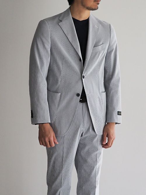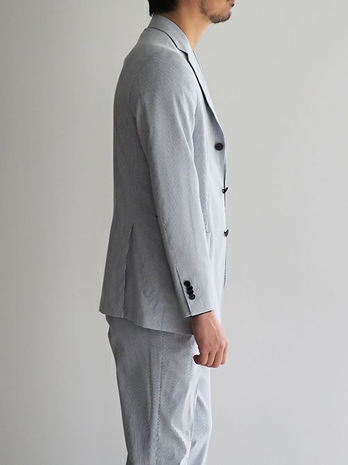 ノッチドラペル3つボタンの段返り、ポケットはバルカパッチ仕様。サイドベンツで一枚芯の軽快なジャケットに仕上げています。ストレッチの効いたストレスのない着用感も魅力の一つ。