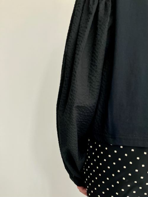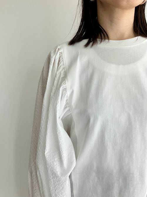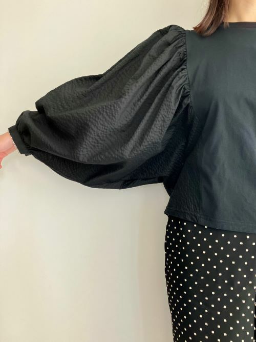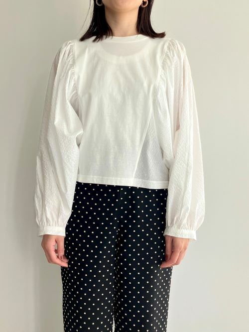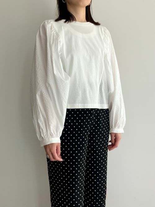 袖は凹凸のあるサッカー布生地で、身頃は上質な細番手の糸を使ったカットソー生地のプルオーバー。見た目はブラウスですが、身頃はカットソーなので着脱も着心地も楽ちんです。