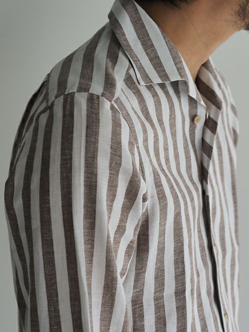 綿麻素材を使用したオープンカラーシャツ。軽やかな着用感で、ブロックストライプが印象的でアクセントになる一着です。