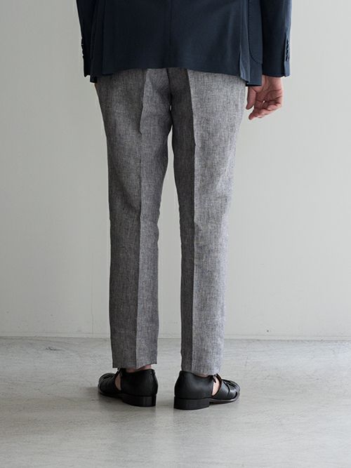 リネン生地のワンプリーツパンツ。ウエスト後ろはゴム仕様ですので、程よく腰回りにゆとりがあります。