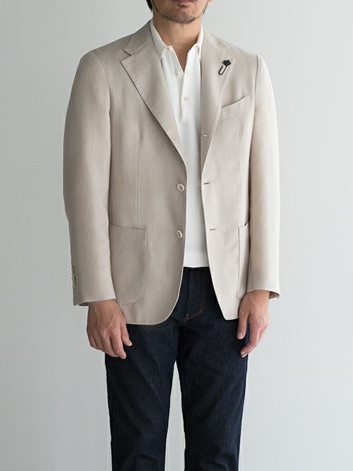 3つ釦の段返りでノッチドラペルにフロントのパッチポケット、そしてサイドベンツのカジュアルジャケット。シンプルなディテールが生地の上質さと仕立ての良さを際立たせており、ブランドアイコンでもあるブートニエールがその名の通り花を添えます。