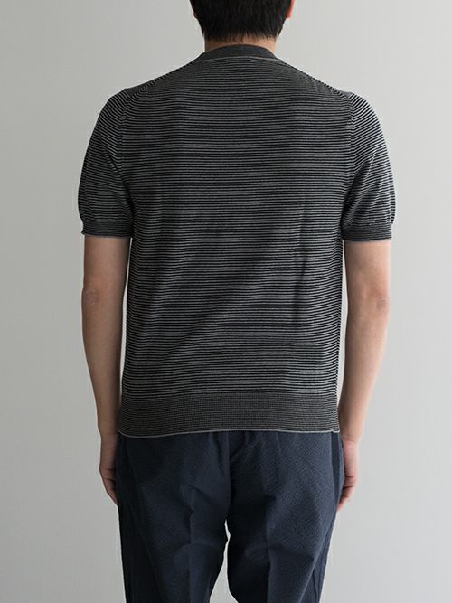 カジュアルな印象の強いボーダー柄ですが、ピッチを細くし、肩口のシルエットもすっきりとコンパクトにする事で、落ち着いた印象のボーダーニットに仕上がっています。カットソーの代わりに気軽に着ていただければ、カジュアル過ぎない大人のコーディネートを演出できます。