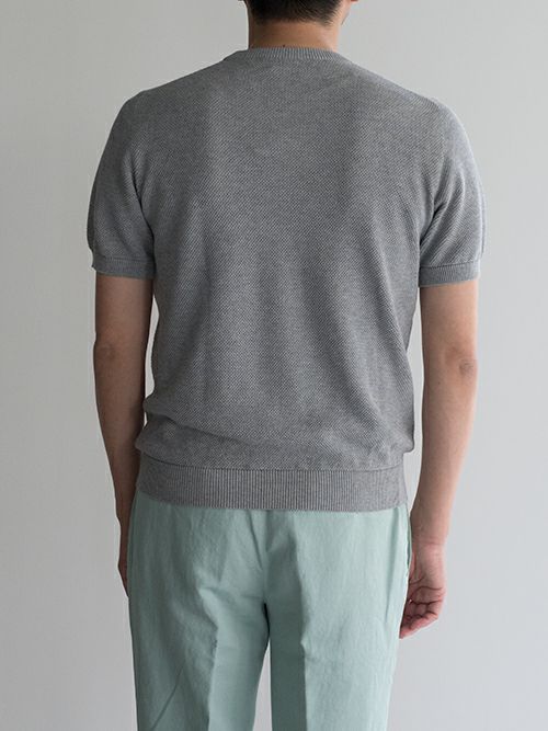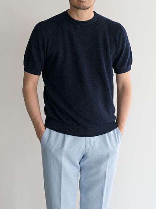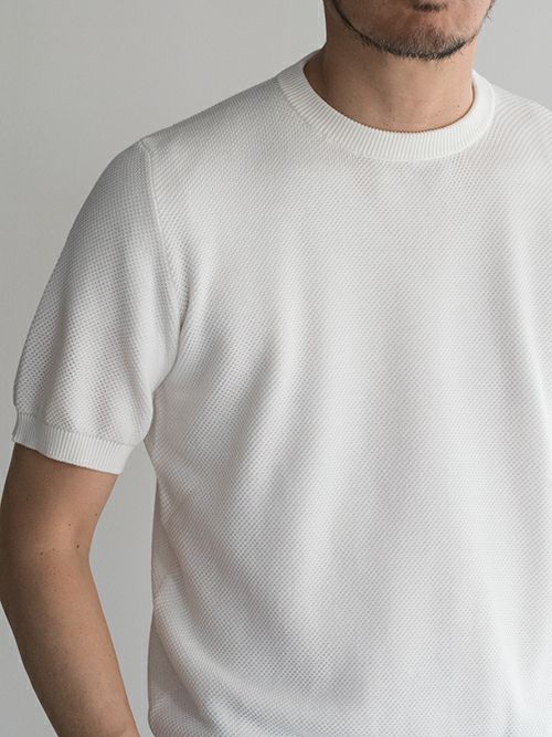 鹿の子編みで、見え方としては程よく立体的なボリュームが出るため、一枚での着用も存在感のある仕上がり。