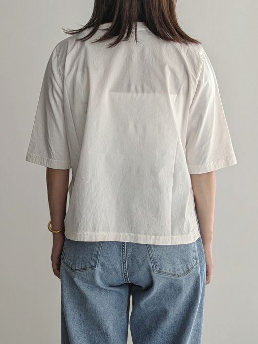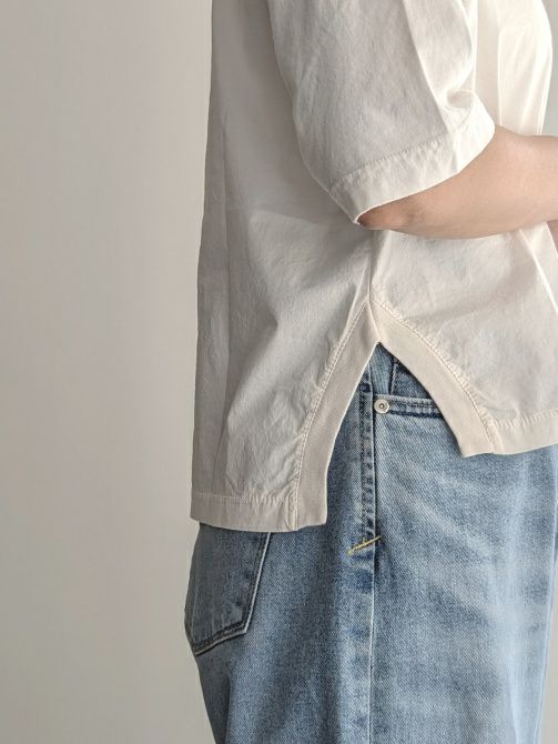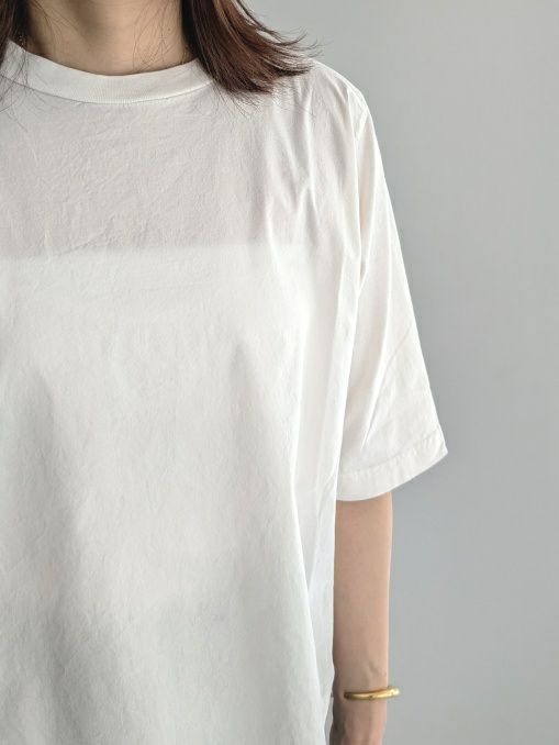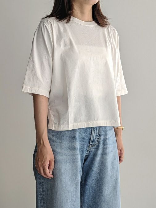 身頃と袖の差材に変化を持たせた5分袖クルーネックカットソー。さらりとした着心地の良い風合いです。デイリー使いがしやすく着丈コンパクトでワイドなパンツやスカートなどボトムにも合わせやすいです。