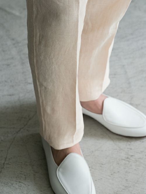 リネン生地のワンプリーツパンツ。ウエスト後ろはゴム仕様ですので、程よく腰回りにゆとりがあります。