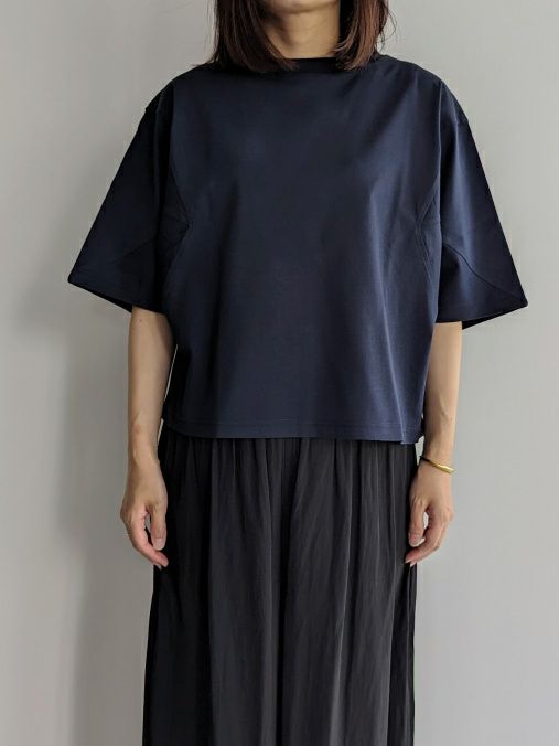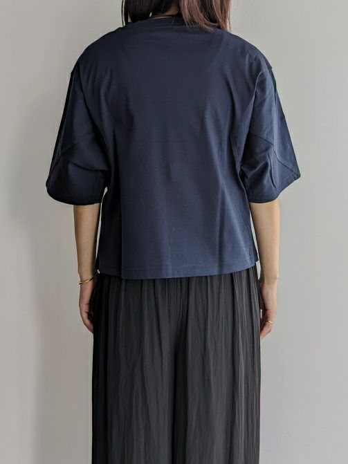 紡績過程で短い繊維を取り除き、繊細な綿糸を使用したTシャツ。糸の段階でマーセライズ加工を施しており、シルクに近い質感を実現しています。