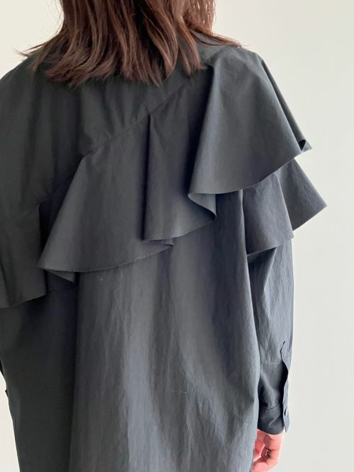 遊び心があるフリルブラウススタンダードなシルエットにたすき掛けフリルが立体的でポイントになるシャツです。張りのあるコットン生地でキレイ目にもカジュアルにも合わせていただけます。シンプルなコーディネートでも動きのある女性らしいスタイリングになります。
