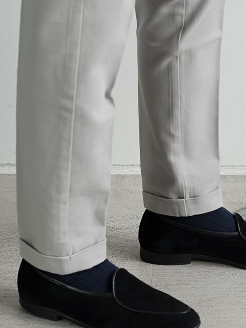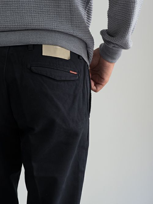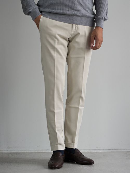 すっきりした腰回りと裾のシルエットながら、ストレッチが効いているため窮屈さを感じずに着用いただけます。