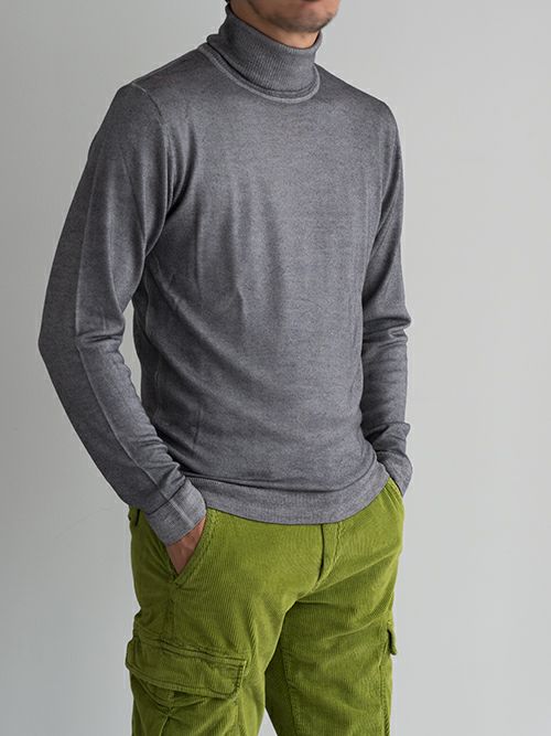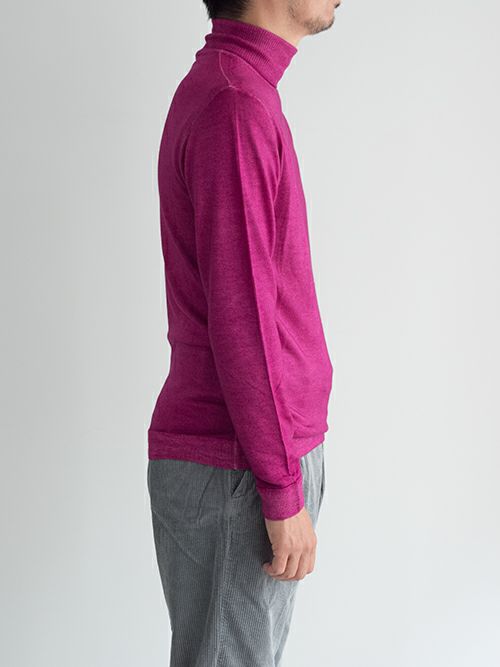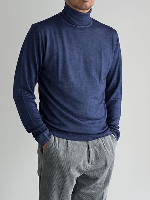 ウール100%の製品染めタートルネックニット。