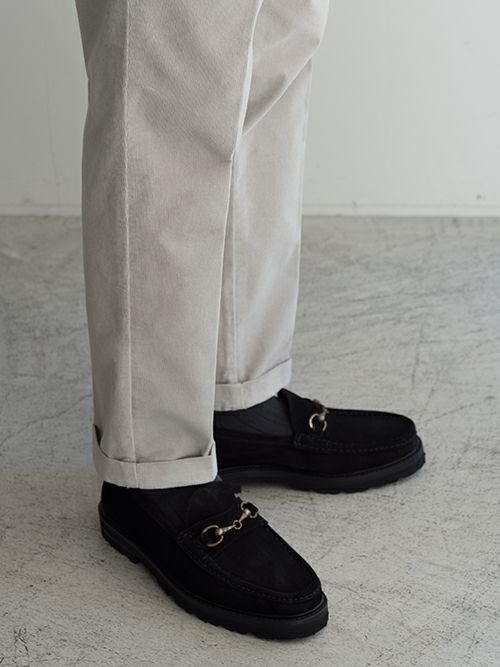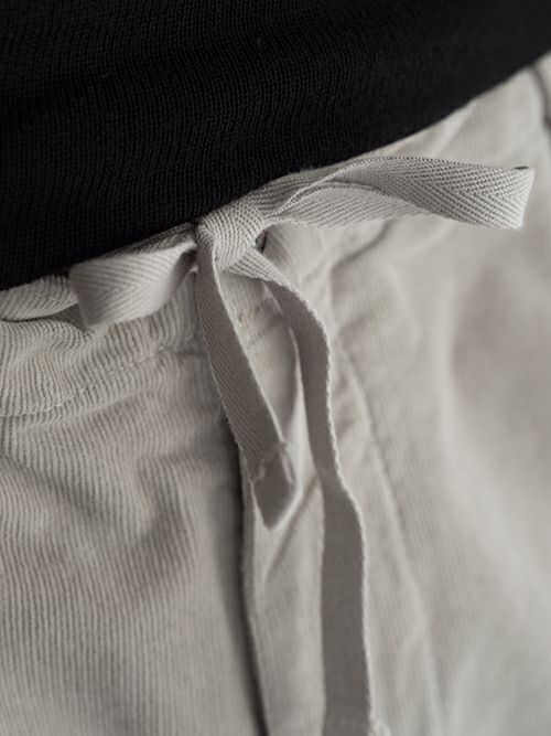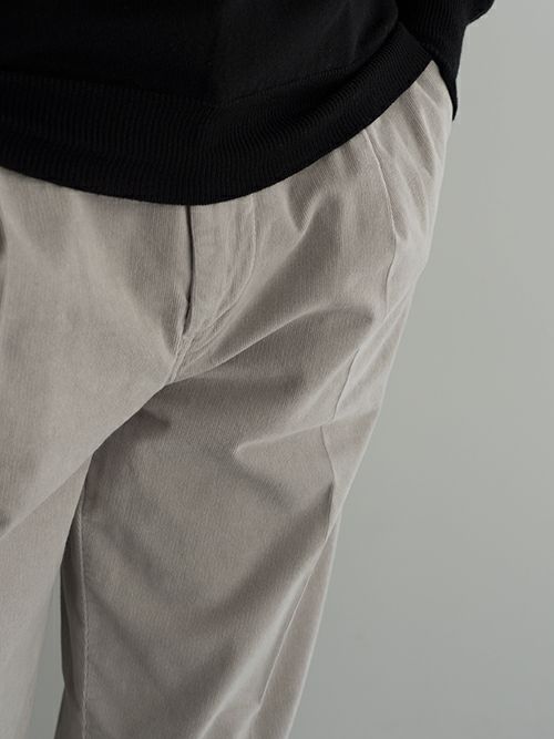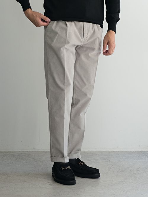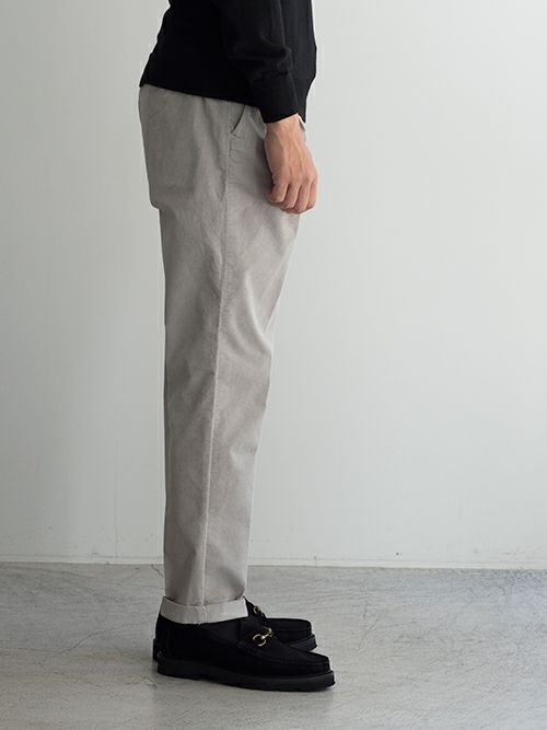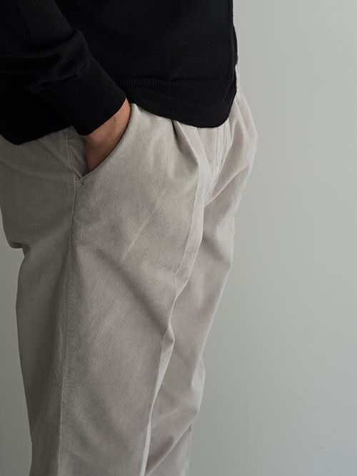 綺麗なテーパードシルエット且つ、ストレッチの効いたストレスフリーな履き心地です。後ろウエストにゴムを、前には内側ドローコードを配しておりサイズの微調整が可能です。