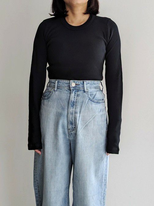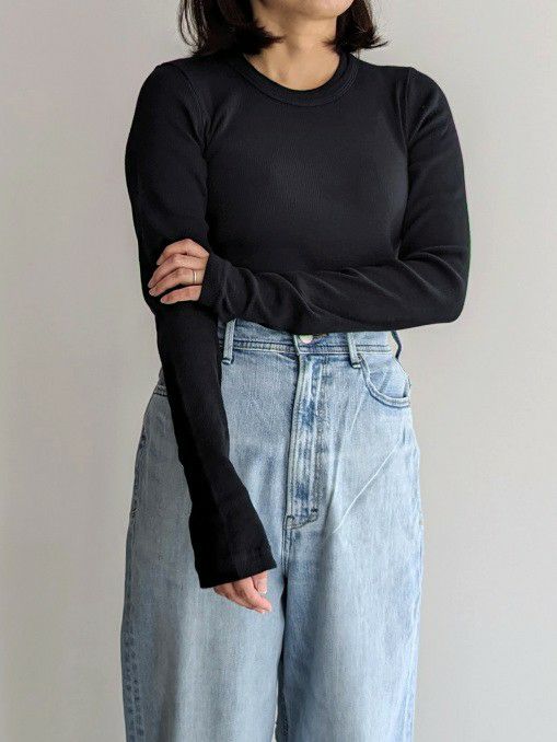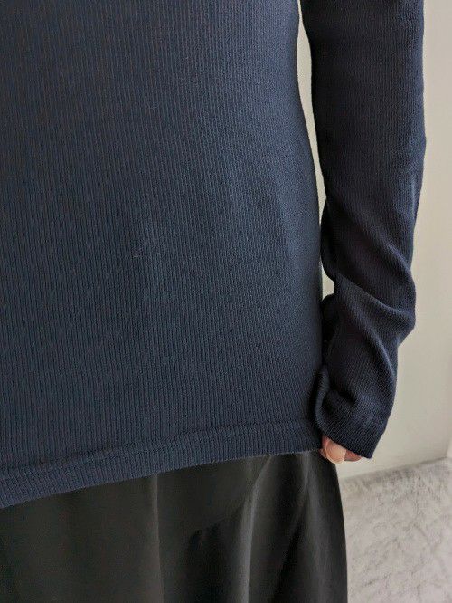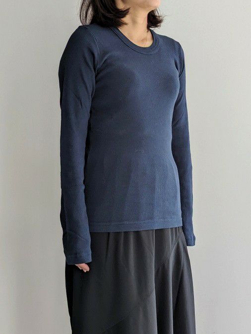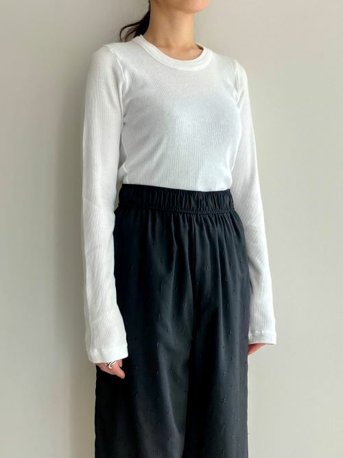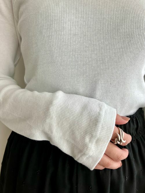 コットン100%のリブクルーネックカットソー。全体的にインナーようにタイトなサイジングにしてありますが、肌触りも柔らかく程よく馴染んでくれます。着丈は長めになっていますのでボトムにインして頂くとスッキリと着用頂けます。ネック部分は開きすぎず程よいネックの開き感です。ホワイトは多少の透け感がございます。シャツワンピースやニットカーディガンのインナーに活躍するアイテムです。