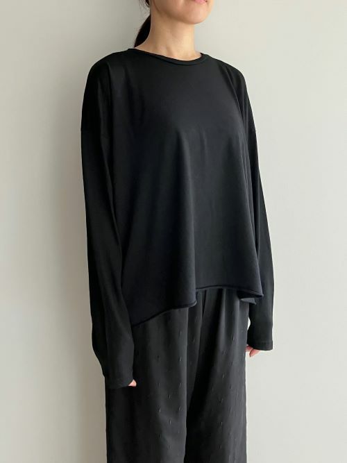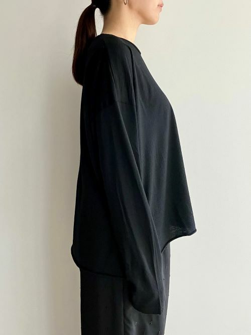 ドロップショルダーのクルーネックウールカットソー。ゆとりのある身幅と切りっぱなしの裾が、気取り過ぎないリラックスした雰囲気を演出します。非常に薄く肌触りもよいので、ジャケットやローゲージカーディガンのインナーにも適しています。