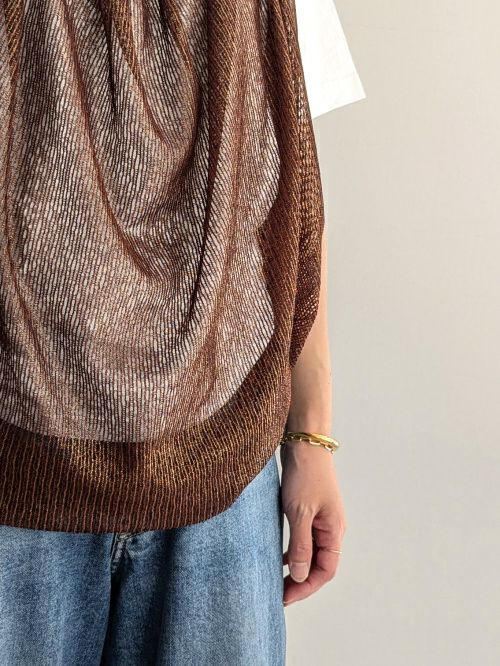 シアー感と表情のあるストライプ編地に、全面箔プリントを施したラップスカートです。 膝下丈のウエストは別布ひもでスカートのギャザー具合を好みに調節できる仕様。トップスとしても着用でき、様々が使い方ができます。プラスワン、アクセサリー感覚で取り入れられるアイテムです。
