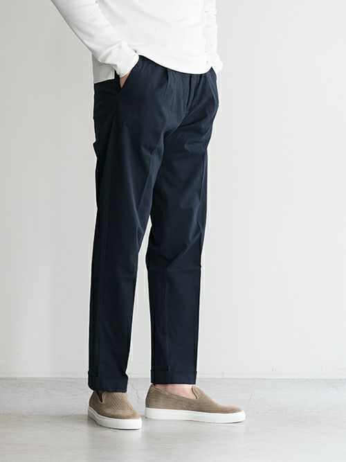 ワンタックでストレッチが効いており、すっきりした裾のシルエットにも関わらず窮屈さを感じずに着用いただけます。