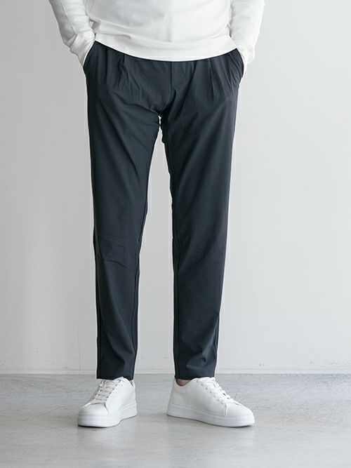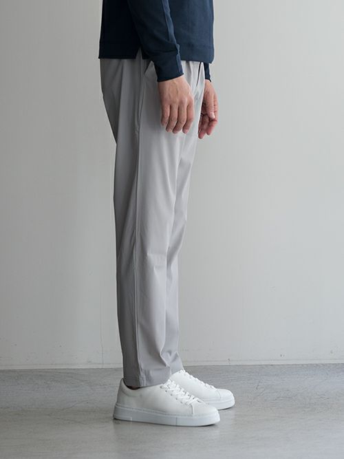 ストレッチ混でゴムのように伸びが良いナイロンパンツ。履き心地の良さは言うまでもありませんが、上質な生地感と綺麗なテーパードシルエットにより、大人の上品さを損ないません。